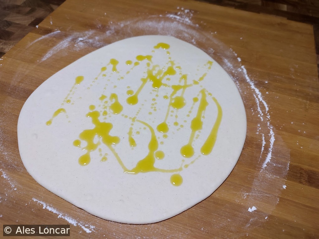 - After the dough has rested, stretch each ball to about 20 cm in diameter and brush it with 3 tablespoons of butter.