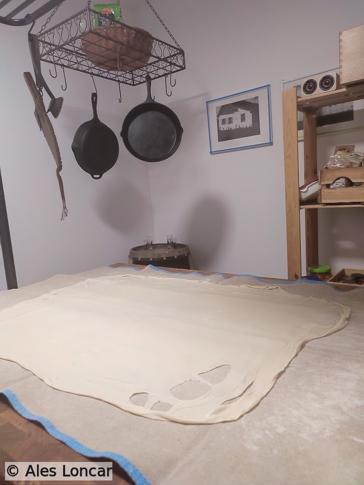 The preparation is not exactly easy. For the dough, you only need wheat flour, salt, and water, but the tricky part is rolling it out very thin. The best way is over a table covered with a linen cloth, brushed with a little butter.