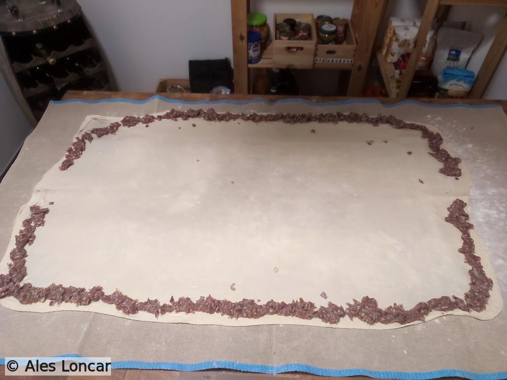 - Place the meat filling along the edge of the dough across its full length, then brush with a little more butter.