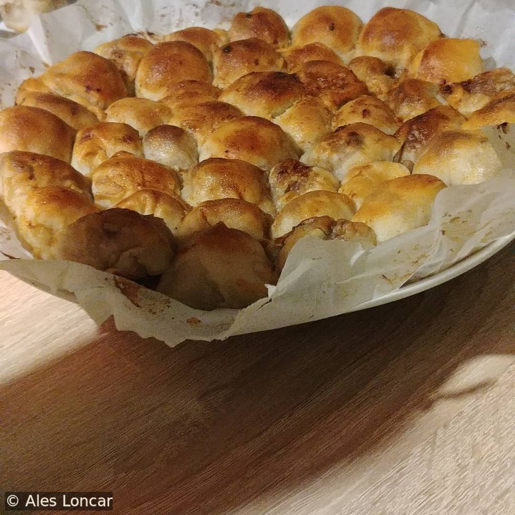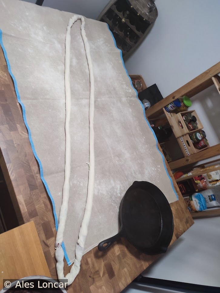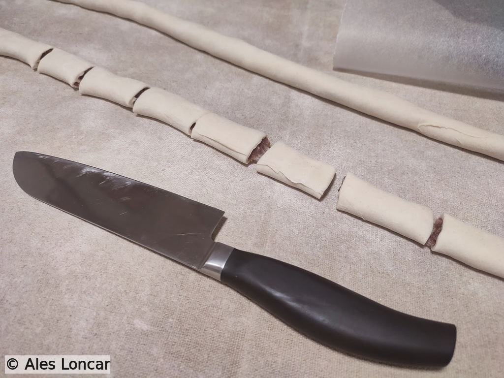 - Roll the dough into a long snake-like roll and cut it into pieces about 3-4 cm wide.
