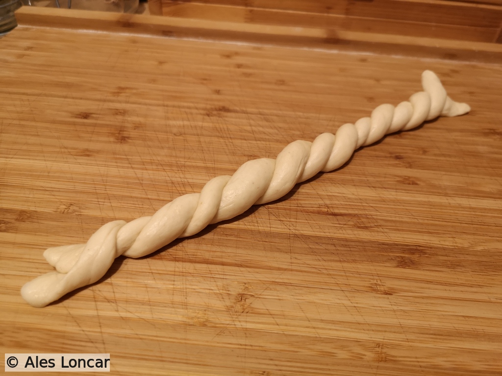 - Shape each roll into a circle, then cut it in half and twist the two strands into a spiral.