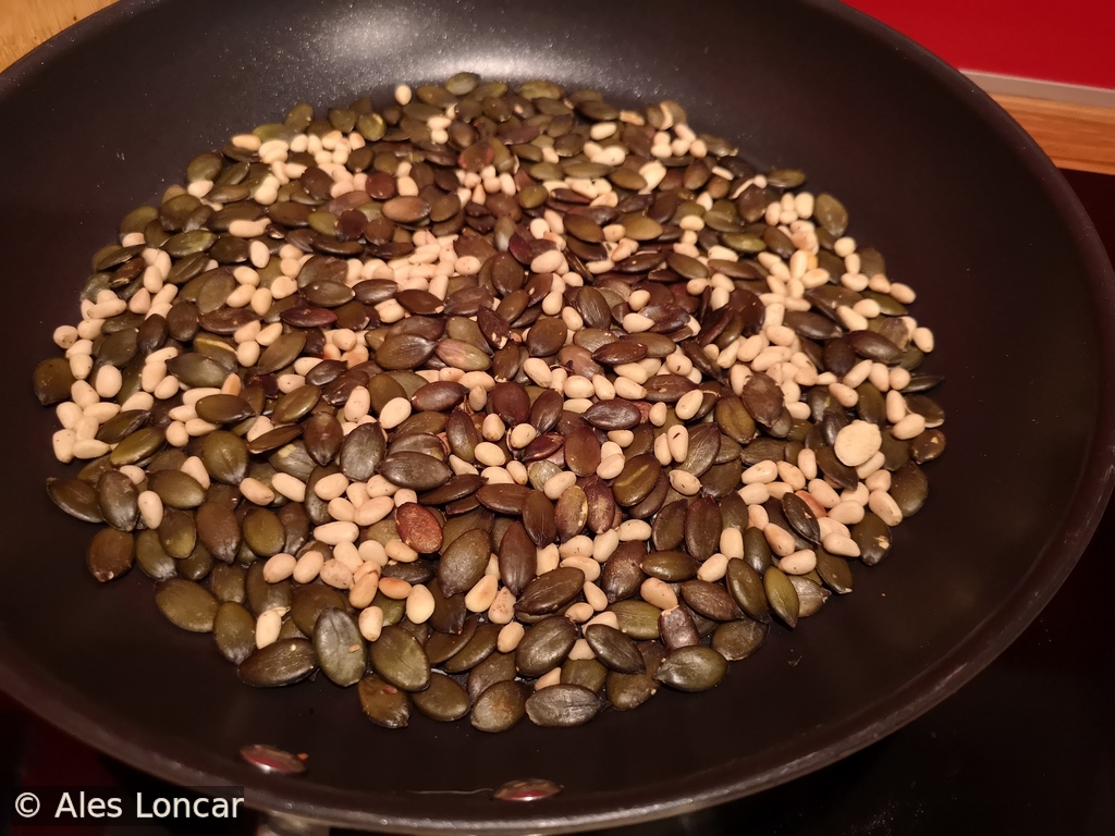 - Toast the pumpkin seeds in a pan. If you like, you can also add a few extra seeds or nuts, such as pine nuts or sunflower seeds.