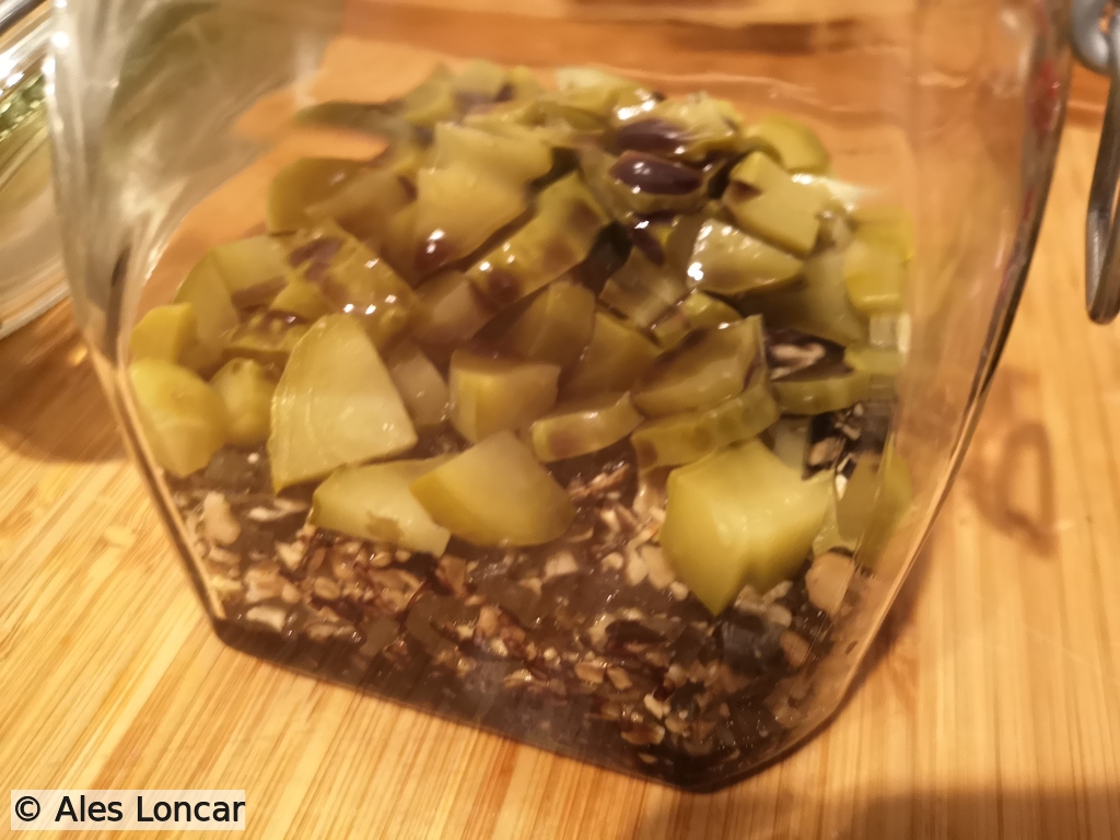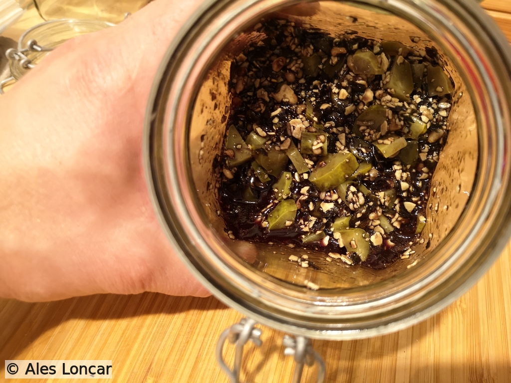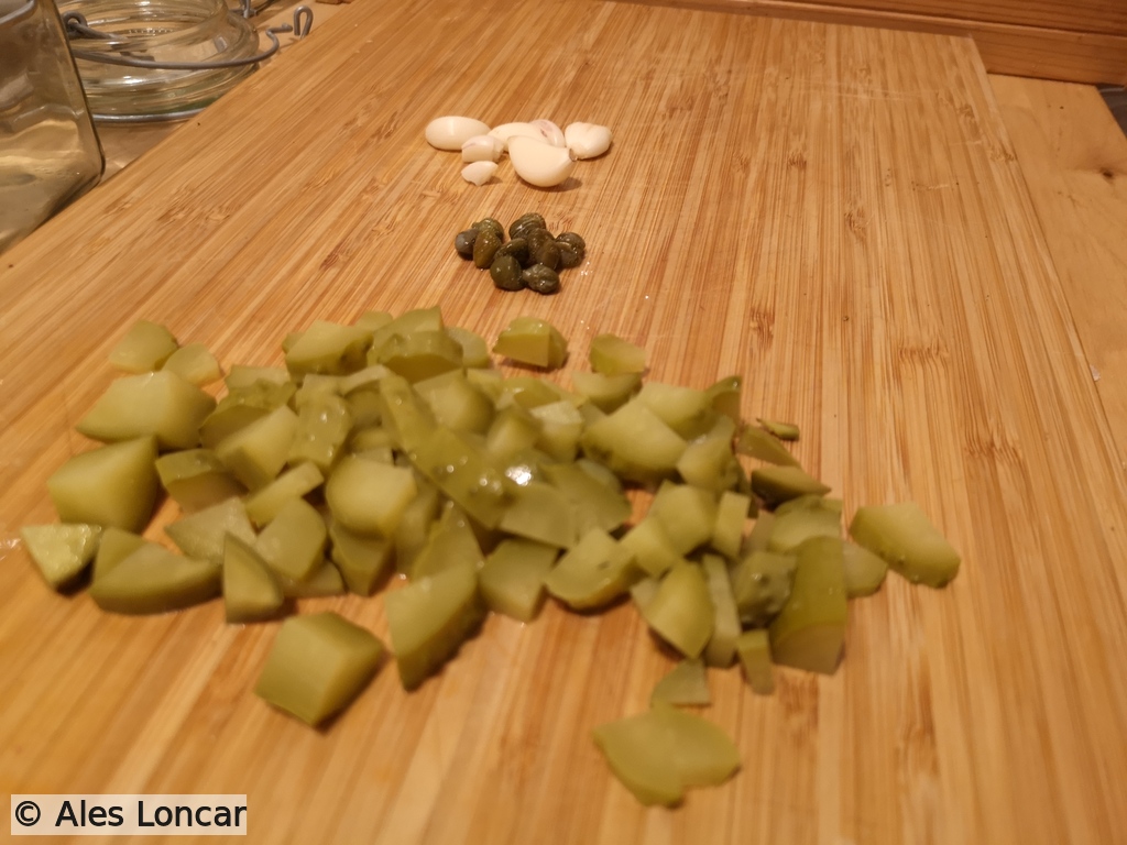 - Add garlic, pumpkin seed oil, salt, and, if you want a sharper flavor, some finely chopped pickled cucumbers and capers.