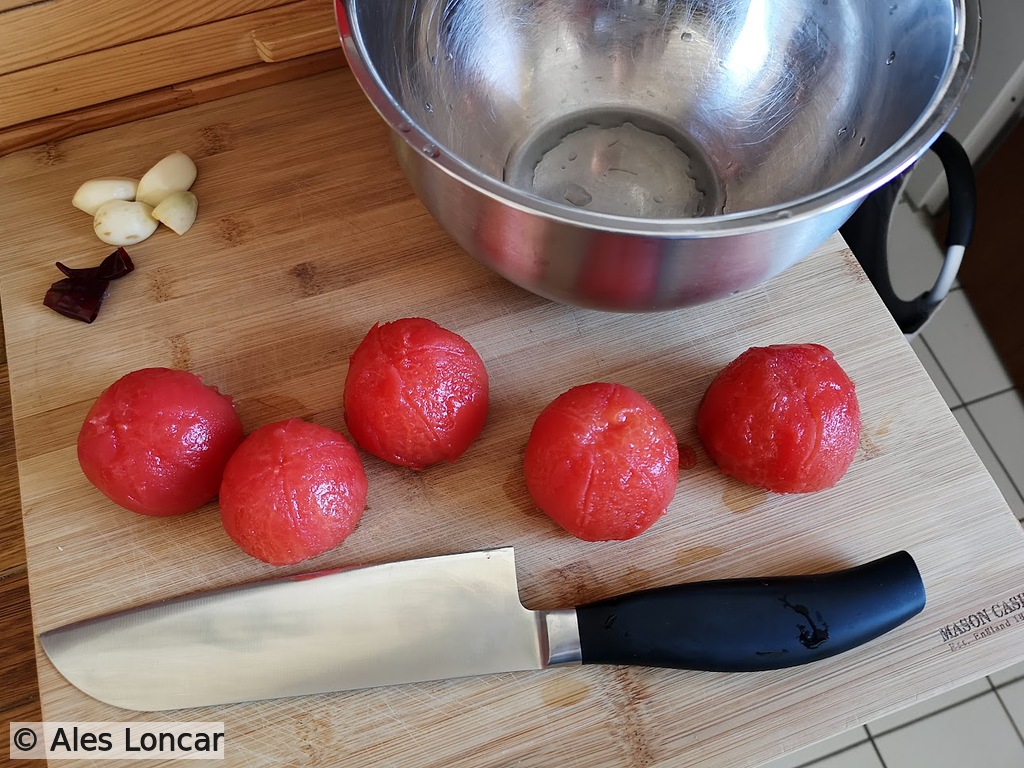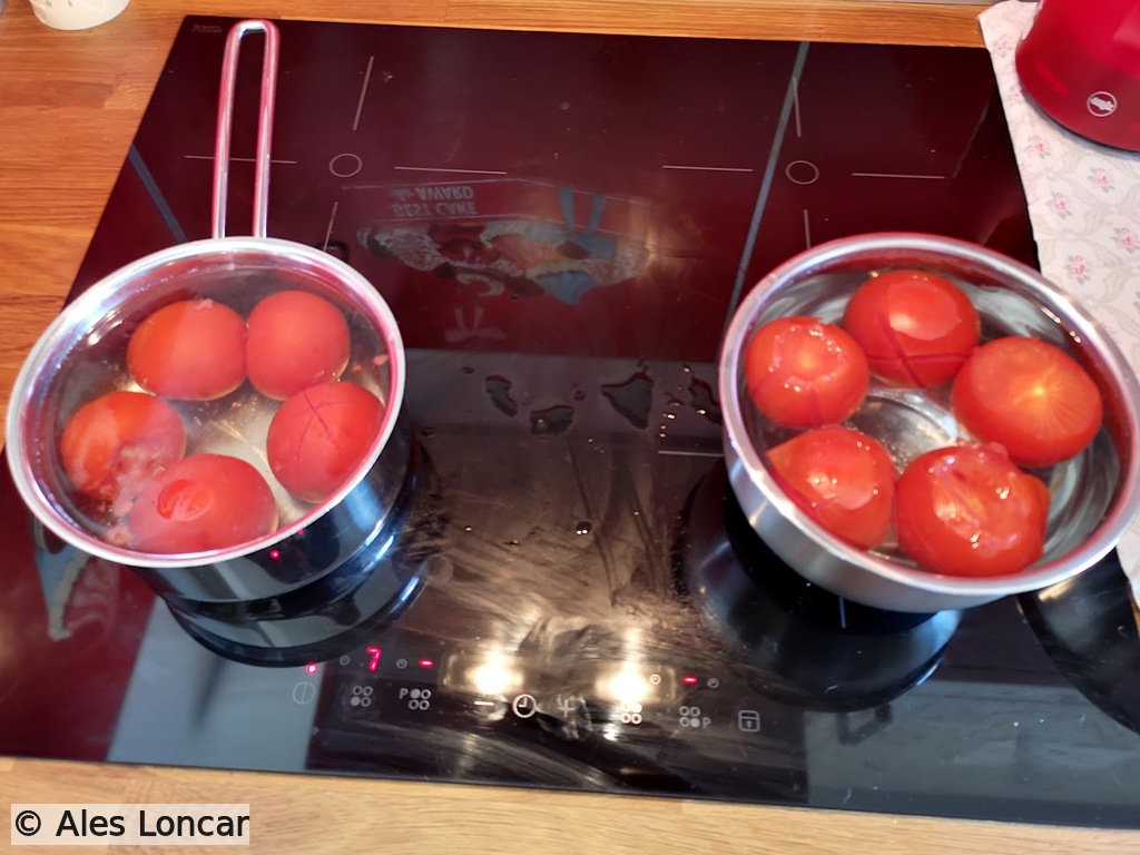 - Blanch the tomatoes in hot water for a short time, then peel them.
