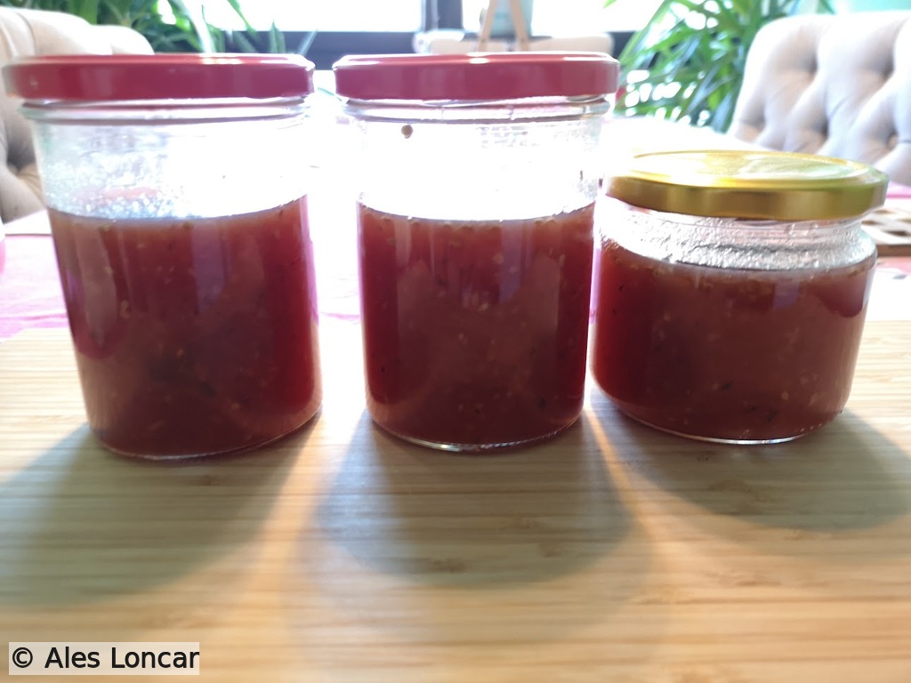 A vibrant spicy tomato jam made from ripe tomatoes, lemon juice, gelling sugar, and chili.