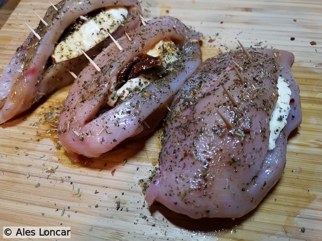 - Stuff each pocket with a generous slice of mozzarella and a piece of sun-dried tomatoes.