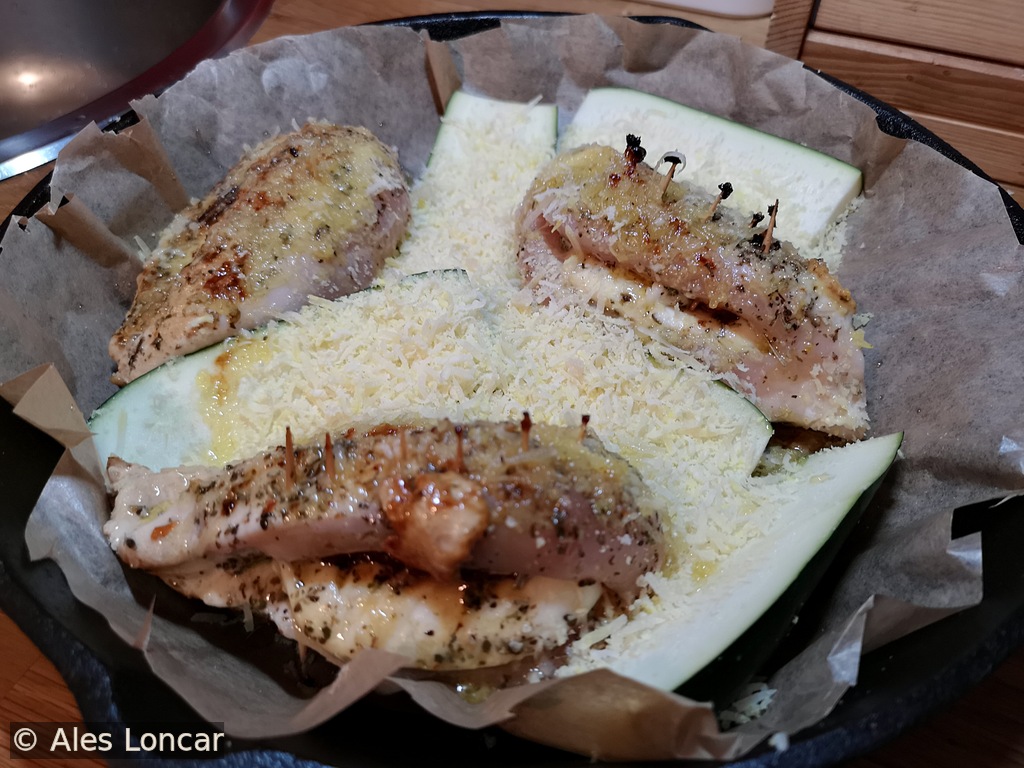The zucchini and Parmesan on the bottom turn into a kind of savory crust, especially when the chicken juices and oil mingle with the cheese. It is a very satisfying example of what happens when you open the fridge, trust your instincts, and cook anyway.